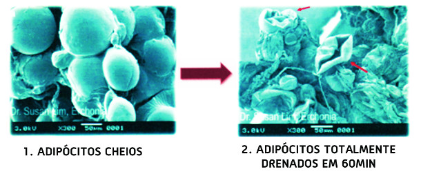 Antes do tratamento, os adipócitos, ou células gordas, estão cheios de gordura (reservas). A tecnologia Liposhaper® enfraquece a membrana dos adipócitos e a eliminação de gordura, que ficou disponível por esta ação, é feita através do processo de combustão natural do organismo que vai utilizar aquelas reservas como forma de energia.